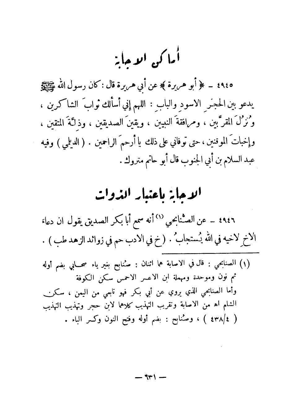 4946- عن الصنابحي1 أنه سمع أبا بكر الصديق يقول "إن دعاء الأخ لأخيه في الله يستجاب". "خ في الأدب حم في زوائد الزهد طب".
