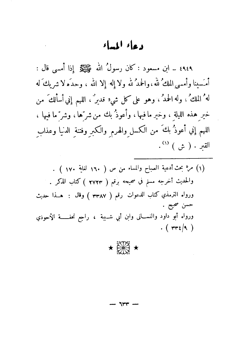 4949- ابن مسعود: "كان رسول الله صلى الله عليه وسلم إذا أمسى قال: "أمسينا وأمسى الملك لله، والحمد لله ولا إله إلا الله، وحده لا شريك له له الملك، وله الحمد، وهو على كل شيء قدير، اللهم إني أسألك من خير هذه الليلة، وخير ما فيها، وأعوذ بك من شرها، وشر ما فيها، اللهم إني أعوذ بك من الكسل والهرم والكبر وفتنة الدنيا وعذاب القبر". "ش"1.