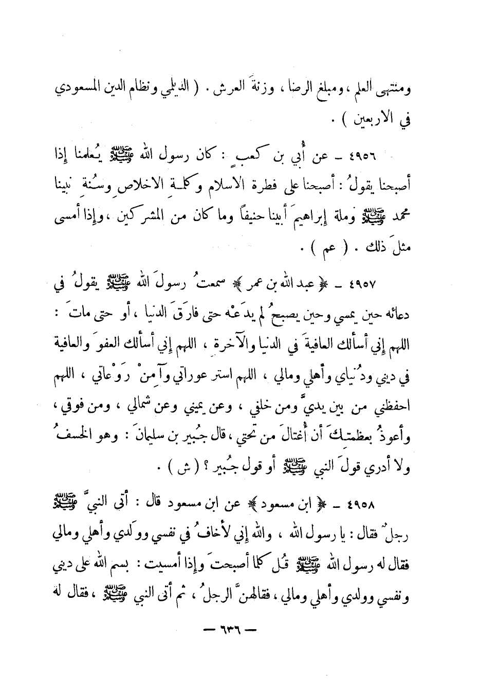 4958- "ابن مسعود" عن ابن مسعود قال: أتى النبي صلى الله عليه وسلم رجل فقال: "يا رسول الله، والله إني لأخاف في نفسي وولدي وأهلي ومالي فقال له رسول الله صلى الله عليه وسلم قل كلما أصبحت وإذا أمسيت: "بسم الله على ديني ونفسي وولدي وأهلي ومالي"، فقالهن الرجل، ثم أتى النبي صلى الله عليه وسلم، فقال له
