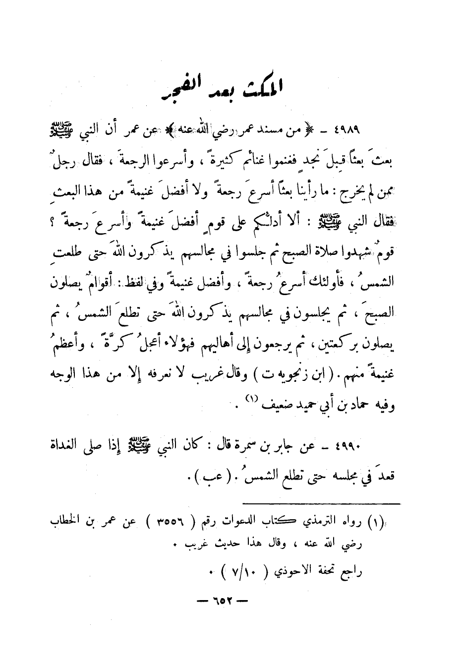 4989- "من مسند عمر رضي الله عنه" عن عمر أن النبي صلى الله عليه وسلم بعث بعثا قبل نجد فغنموا غنائم كثيرة، وأسرعوا الرجعة، فقال رجل ممن لم يخرج: ما رأينا بعثا أسرع رجعة ولا أفضل غنيمة من هذا البعث فقال النبي صلى الله عليه وسلم: "ألا أدلكم على قوم أفضل غنيمة وأسرع رجعة؟ قوم شهدوا صلاة الصبح ثم جلسوا في مجالسهم يذكرون الله حتى طلعت الشمس، فأولئك أسرع رجعة، وأفضل غنيمة وفي لفظ: أقوام يصلون الصبح، ثم يجلسون في مجالسهم يذكرون الله حتى تطلع الشمس، ثم يصلون بركعتين، ثم يرجعون إلى أهاليهم فهؤلاء أعجل كرة، وأعظم غنيمة منهم". "ابن زنجويه ت" وقال غريب لا نعرفه إلا من هذا الوجه وفيه حماد بن أبي حميد ضعيف1.