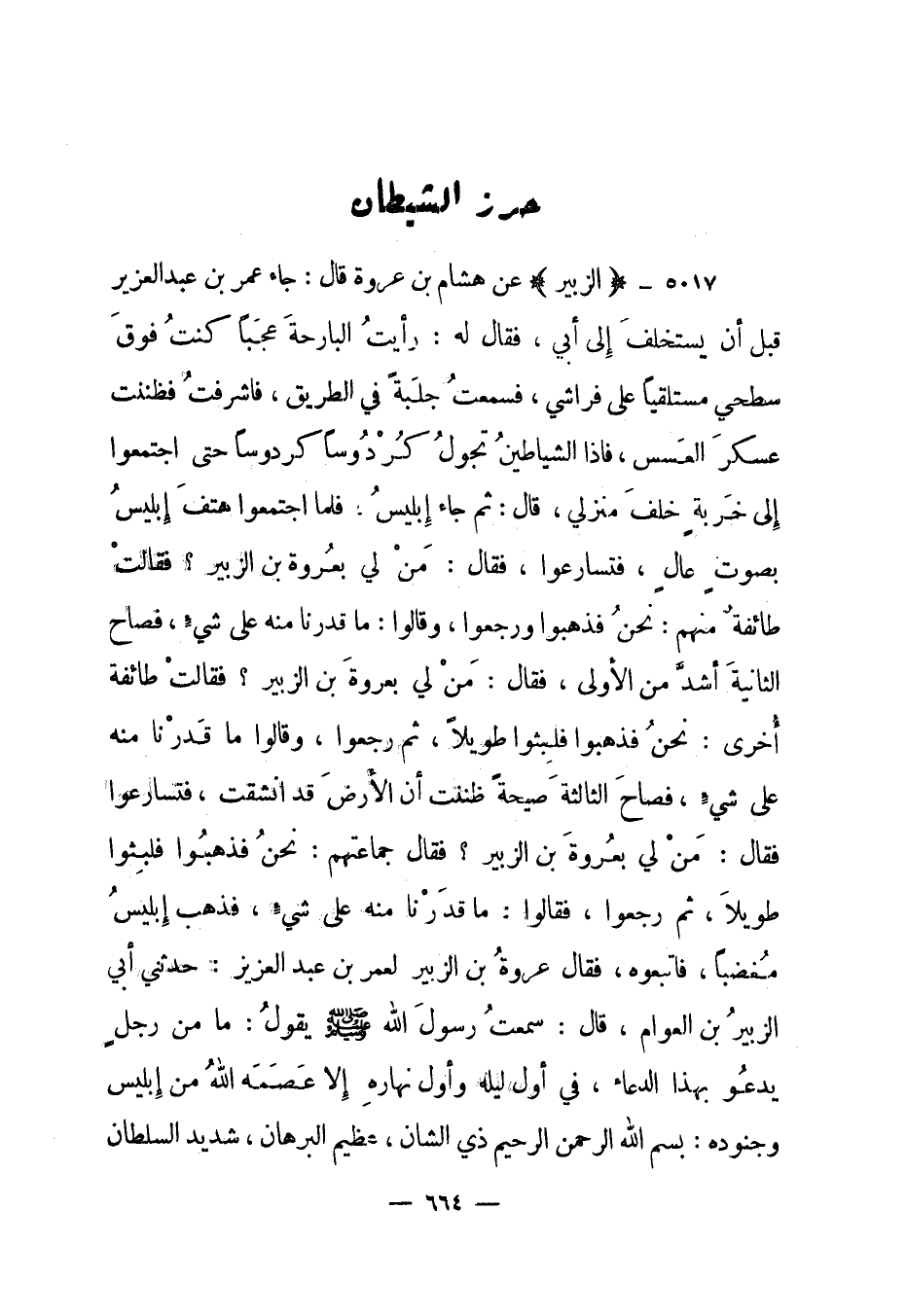 5017- "الزبير" عن هشام بن عروة قال: "جاء عمر بن عبد العزيز قبل أن يستخلف إلى أبي، فقال له: رأيت البارحة عجبا كنت فوق سطحي مستلقيا على فراشي، فسمعت جلبة في الطريق، فأشرفت فظننت عسكر العسس، فإذا الشياطين تجول كردوسا كردوسا حتى اجتمعوا إلى خربة خلف منزلي، قال: ثم جاء إبليس: فلما اجتمعوا هتف إبليس بصوت عال، فتسارعوا، فقال: من لي بعروة بن الزبير؟ فقالت طائفة منهم: نحن فذهبوا ورجعوا، وقالوا: ما قدرنا منه على شيء، فصاح الثانية أشد من الأولى، فقال: من لي بعروة بن الزبير؟ فقالت طائفة أخرى: نحن فذهبوا فلبثوا طويلا، ثم رجعوا، وقالوا ما قدرنا منه على شيء، فصاح الثالثة صيحة ظننت أن الأرض قد انشقت، فتسارعوا فقال: من لي بعروة بن الزبير؟ فقال جماعتهم: نحن فذهبوا فلبثوا طويلا، ثم رجعوا، فقالوا: ما قدرنا منه على شيء، فذهب إبليس مغضبا، فاتبعوه، فقال عروة بن الزبير لعمر بن عبد العزيز: حدثني أبي الزبير بن العوام، قال: سمعت رسول الله صلى الله عليه وسلم يقول: ما من رجل يدعو بهذا الدعاء، في أول ليله وأول نهاره إلا عصمه الله من إبليس وجنوده: بسم الله الرحمن الرحيم ذي الشان، عظيم البرهان، شديد السلطان