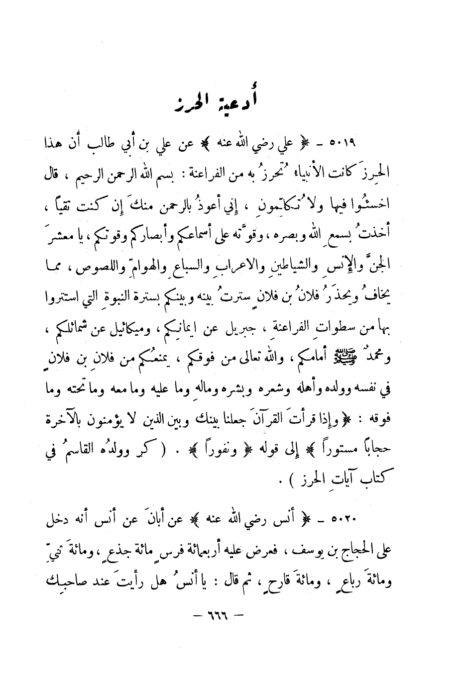 5019- "علي رضي الله عنه" عن علي بن أبي طالب "أن هذا الحرز كانت الأنبياء تحرز به من الفراعنة: بسم الله الرحمن الرحيم، قال اخسئوا فيها ولا تكلمون، إني أعوذ بالرحمن منك إن كنت تقيا، أخذت بسمع الله وبصره، وقوته على أسماعكم وأبصاركم وقوتكم، يا معشر الجن والإنس والشياطين والأعراب والسباع والهوام واللصوص، مما يخاف ويحذر فلان ابن فلان سترت بينه وبينكم بسترة النبوة التي استتروا بها من سطوات الفراعنة، جبريل عن أيمانكم، وميكائيل عن شمائلكم، ومحمد صلى الله عليه وسلم أمامكم، والله تعالى من فوقكم، يمنعكم من فلان بن فلان في نفسه وولده وأهله وشعره وبشره وماله وما عليه وما معه وما تحته وما فوقه: {وَإِذَا قَرَأْتَ الْقُرْآنَ جَعَلْنَا بَيْنَكَ وَبَيْنَ الَّذِينَ لا يُؤْمِنُونَ بِالْآخِرَةِ حِجَاباً مَسْتُوراً} إلى قوله {نُفُوراً} ". "كر وولده القاسم في كتاب آيات الحرز".