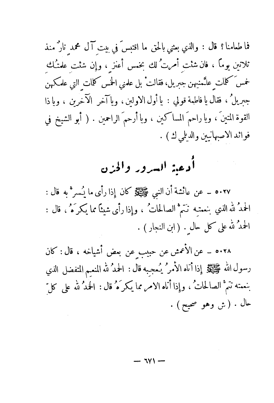5027- عن عائشة أن النبي صلى الله عليه وسلم كان إذا رأى ما يسر به قال: "الحمد لله الذي بنعمته تتم الصالحات، وإذا رأى شيئا مما يكره، قال: الحمد لله على كل حال". "ابن النجار".