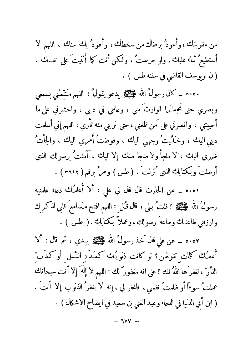 5051- عن الحارث قال قال لي علي: "ألا أعلمك دعاء علمنيه رسول الله صلى الله عليه وسلم؟ قلت بلى، قال قل: اللهم افتح مسامع قلبي لذكرك وارزقني طاعتك وطاعة رسولك، وعملا بكتابك ". "طس".