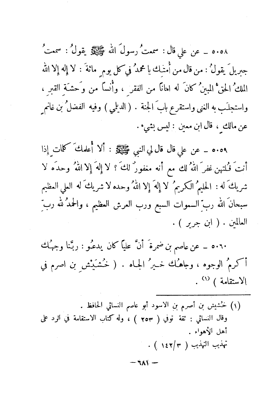 5060- عن عاصم بن ضمرة أن عليا كان يدعو: "ربنا وجهك أكرم الوجوه، وجاهك خير الجاه". "خشيش بن أصرم في الاستقامة1.