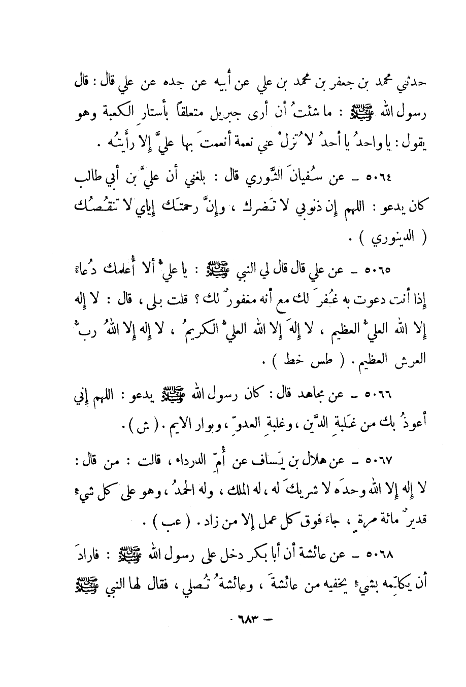 5065- عن علي قال قال لي النبي صلى الله عليه وسلم: "يا علي ألا أعلمك دعاء إذا أنت دعوت به غفر لك مع أنه مغفور لك؟ قلت بلى، قال: لا إله إلا الله العلي العظيم، لا إله إلا الله العلي الكريم، لا إله إلا الله رب العرش العظيم". "طس خط".
