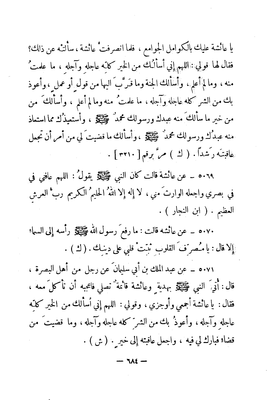 يا عائشة عليك بالكوامل الجوامع، فلما انصرفت عائشة، سألته عن ذلك؟ فقال لها قولي: اللهم إني أسألك من الخير كله عاجله وآجله، ما علمت منه، وما لم أعلم، وأسألك الجنة وما قرب إليها من قول أو عمل، وأعوذ بك من الشر كله عاجله وآجله، ما علمت منه وما لم أعلم، وأسألك من خير ما سألك منه عبدك ورسولك محمد صلى الله عليه وسلم، وأستعيذك مما استعاذ منه عبدك ورسولك محمد صلى الله عليه وسلم، وأسألك ما قضيت لي من أمر أن تجعل عاقبته رشدا ". "ك" مر برقم [3210] .