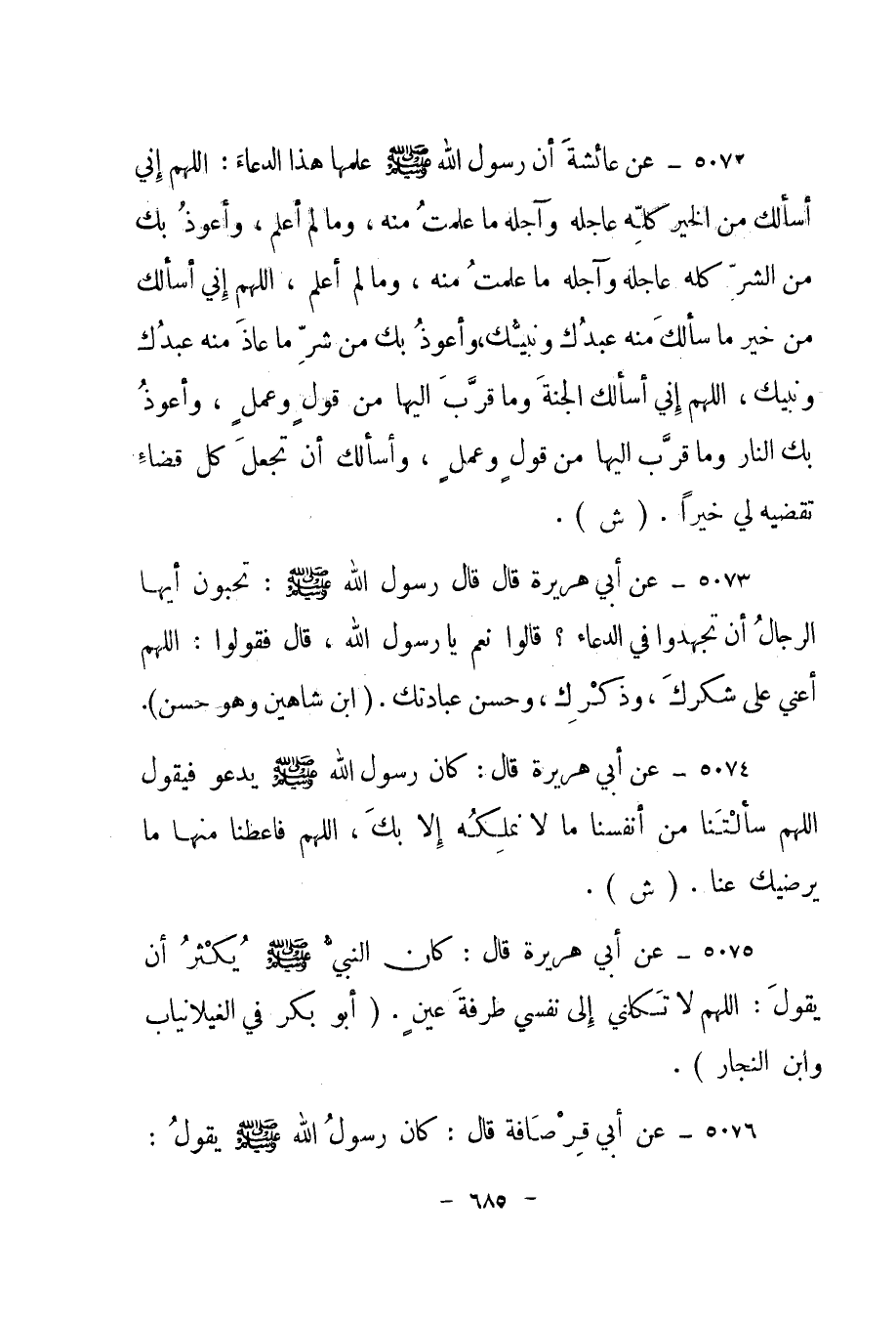 5072- عن عائشة أن رسول الله صلى الله عليه وسلم علمها هذا الدعاء: "اللهم إني أسألك من الخير كله عاجله وآجله ما علمت منه، وما لم أعلم، وأعوذ بك من الشر كله عاجله وآجله ما علمت منه، وما لم أعلم، اللهم إني أسألك من خير ما سألك منه عبدك ونبيك، وأعوذ بك من شر ما عاذ منه عبدك ونبيك، اللهم إني أسألك الجنة وما قرب إليها من قول وعمل، وأعوذ بك من النار وما قرب إليها من قول وعمل، وأسألك أن تجعل كل قضاء تقضيه لي خيرا". "ش".