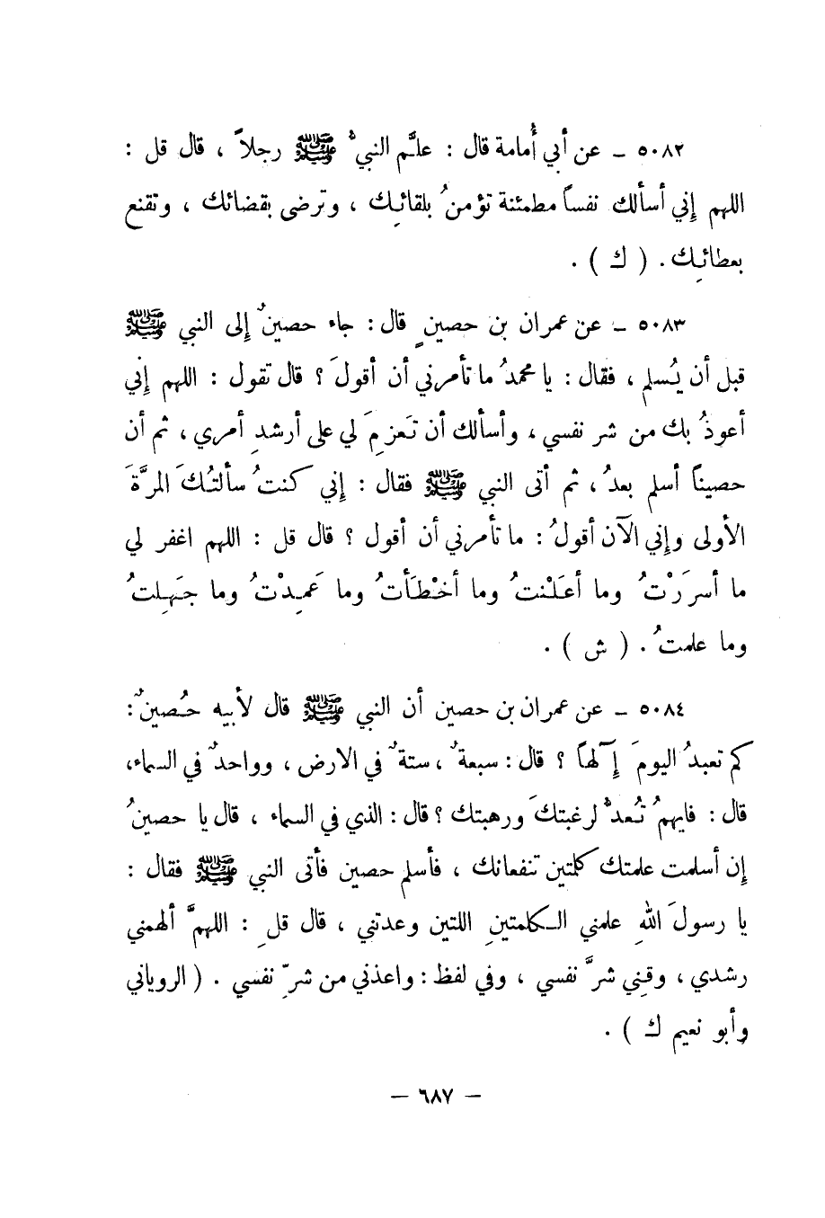 5083- عن عمران بن حصين قال: "جاء حصين إلى النبي صلى الله عليه وسلم قبل أن يسلم، فقال: يا محمد ما تأمرني أن أقول؟ قال تقول: اللهم إني أعوذ بك من شر نفسي، وأسألك أن تعزم لي على أرشد أمري، ثم أن حصينا أسلم بعد، ثم أتى النبي صلى الله عليه وسلم فقال: إني كنت سألتك المرة الأولى وإني الآن أقول: ما تأمرني أن أقول؟ قال قل: اللهم اغفر لي ما أسررت وما أعلنت وما أخطأت وما عمدت وما جهلت وما علمت ". "ش".