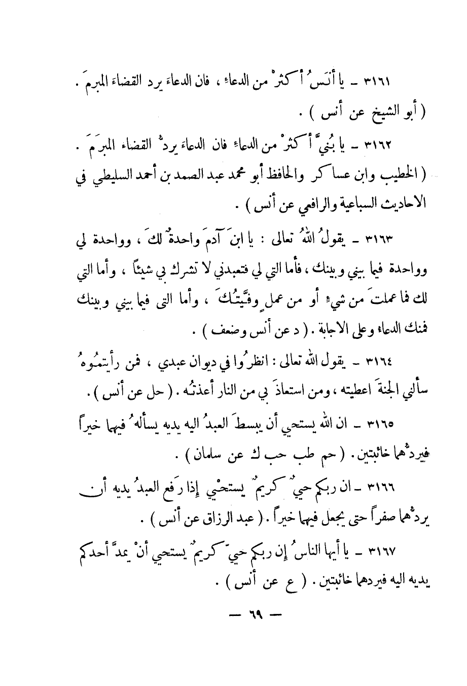 3166- "إن ربكم حيي كريم يستحيي إذا رفع العبد يديه أن يردهما صفرا حتى يجعل فيهما خيرا". "عبد الرزاق عن أنس".