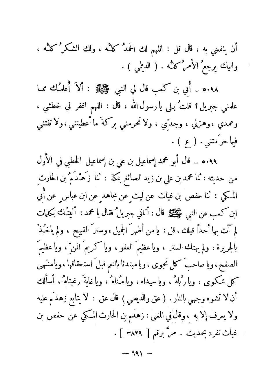5099- قال أبو محمد إسماعيل بن علي بن إسماعيل الخطبي في الأول من حديثه: ثنا محمد بن علي بن زيد الصائغ بمكة: ثنا زهدم بن الحارث المكي: ثنا حفص بن غياث عن ليث عن مجاهد عن ابن عباس عن أبي ابن كعب عن النبي صلى الله عليه وسلم قال: "أتاني جبريل فقال يا محمد: أتيتك بكلمات لم آت بها أحدا قبلك، قل: يا من أظهر الجميل، وستر القبيح، ولم يأخذ بالجريرة، ولم يهتك الستر، ويا عظيم العفو، ويا كريم المن، ويا عظيم الصفح، ويا صاحب كل نجوى، ويا مبتدئا بالنعم قبل استحقاقها، ويا منتهى كل شكوى، ويا رباه، ويا سيداه، ويا مناه، ويا غاية رغبتاه، أسالك أن لا تشوه وجهي بالنار". "عق والديلمي" قال عق: لا يتابع زهدم عليه ولا يعرف إلا به، وقال في المغنى: زهدم بن الحارث المكي عن حفص بن غياث تفرد بحديث. مر برقم [3829] .