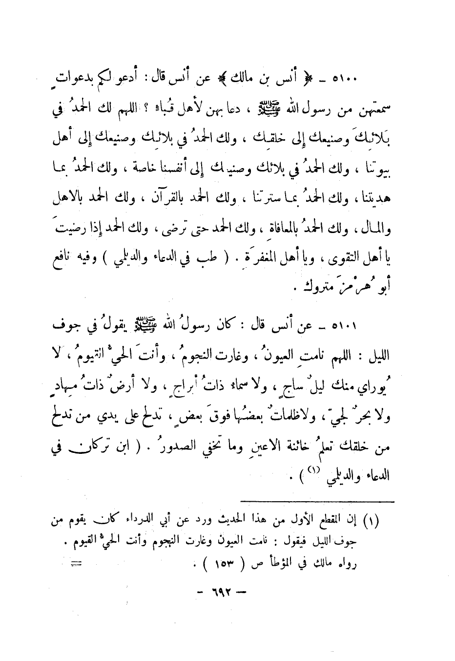 1 إن المقطع الأول من هذا الحديث ورد عن أبي الدرداء كان يقوم من جوف الليل فيقول: نامت العيون وغارت النجوم وأنت الحي القيوم. رواه مالك في الموطأ ص "153". =