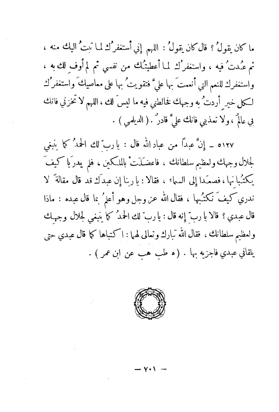 5127- إن عبدا من عباد الله قال: "يا رب لك الحمد كما ينبغي لجلال وجهك ولعظيم سلطانك، فأعضلت بالملكين، فلم يدريا كيف يكتبانها، فصعدا إلى السماء، فقالا: يا ربنا إن عبدك قد قال مقالة لا ندري كيف نكتبها، فقال الله عز وجل وهو أعلم بما قال عبده: ماذا قال عبدي؟ قالا يا رب إنه قال: يا رب لك الحمد كما ينبغي لجلال وجهك ولعظيم سلطانك، فقال الله تبارك وتعالى لهما: اكتباها كما قال عبدي حتى يلقاني عبدي فأجزيه بها". "هـ طب هب عن ابن عمر".