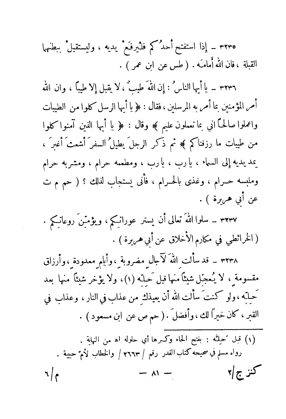 3236- "يا أيها الناس: إن الله طيب، لا يقبل إلا طيبا، وإن الله أمر المؤمنين بما أمر به المرسلين، فقال: {يَا أَيُّهَا الرُّسُلُ كُلُوا مِنَ الطَّيِّبَاتِ وَاعْمَلُوا صَالِحاً إِنِّي بِمَا تَعْمَلُونَ عَلِيمٌ} وقال: {يَا أَيُّهَا الَّذِينَ آمَنُوا كُلُوا مِنْ طَيِّبَاتِ مَا رَزَقْنَاكُمْ} ثم ذكر الرجل يطيل السفر أشعث أغبر، يمد يديه إلى السماء، يا رب، يا رب، ومطعمه حرام، ومشربه حرام، وملبسه حرام، وغذي بالحرام، فأنى يستجاب لذلك؟ " "حم م ت عن أبي هريرة".