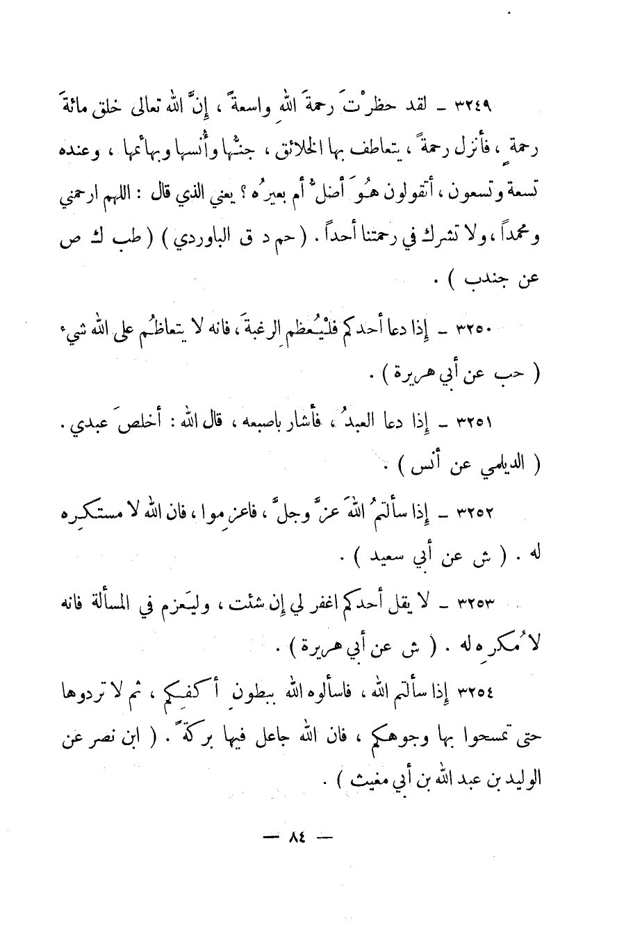 3249- "لقد حظرت رحمة الله واسعة، إن الله تعالى خلق مائة رحمة، فأنزل رحمة، يتعاطف بها الخلائق، جنها وأنسها وبهائمها، وعنده تسعة وتسعون، أتقولون هو أضل أم بعيره؟ يعني الذي قال: اللهم ارحمني ومحمدا، ولا تشرك في رحمتنا أحدا". "حم د ق الباوردي" "طب ك ص عن جندب".