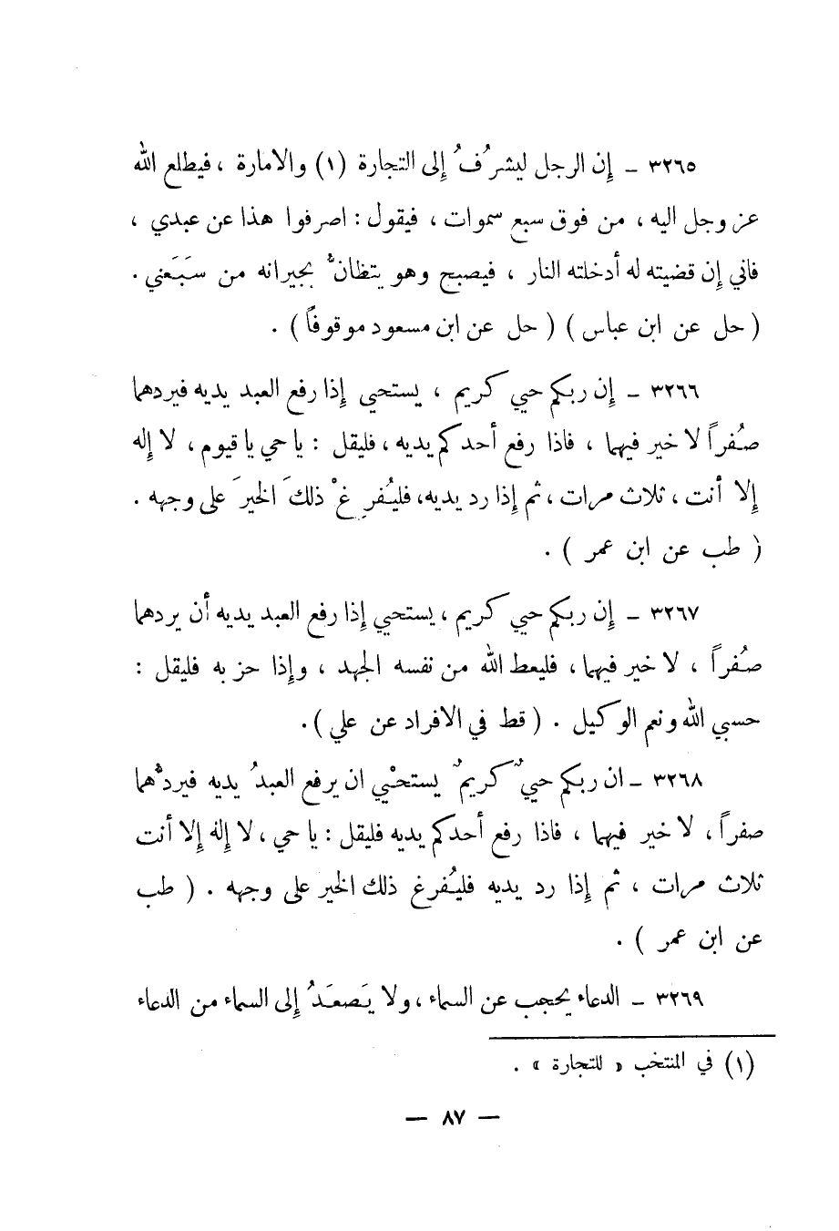 3266- "إن ربكم حيي كريم، يستحيي إذا رفع العبد يديه فيردهما صفرا لا خير فيهما، فإذا رفع أحدكم يديه، فليقل: يا حي يا قيوم، لا إله إلا أنت، ثلاث مرات، ثم إذا رد يديه، فليفرغ ذلك الخير على وجهه". "طب عن ابن عمر".