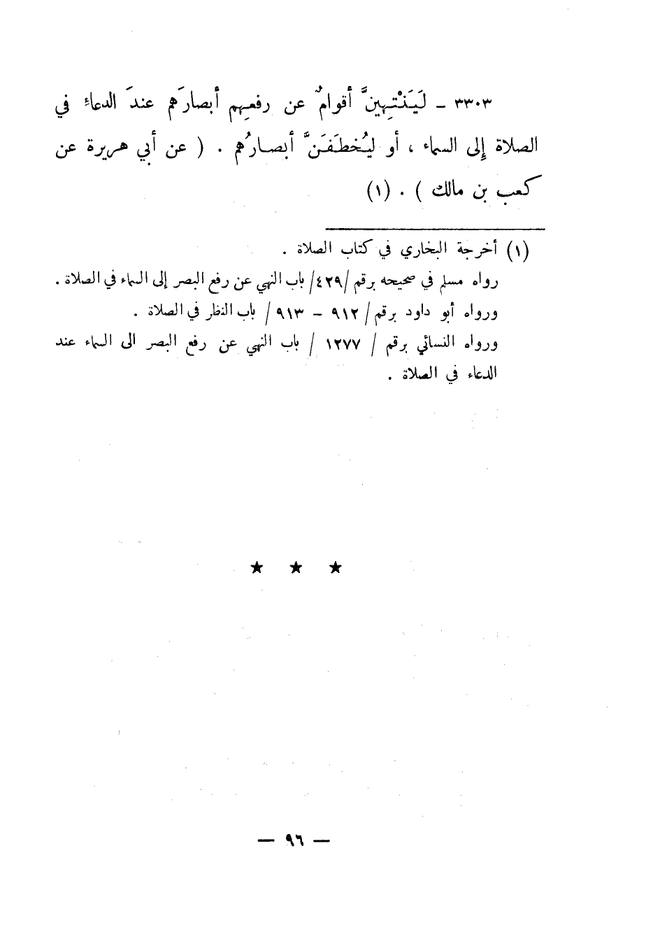 3303- "لينتهين أقوام عن رفعهم أبصارهم عند الدعاء في الصلاة إلى السماء، أو ليخطفن أبصارهم". "عن أبي هريرة عن كعب بن مالك".1