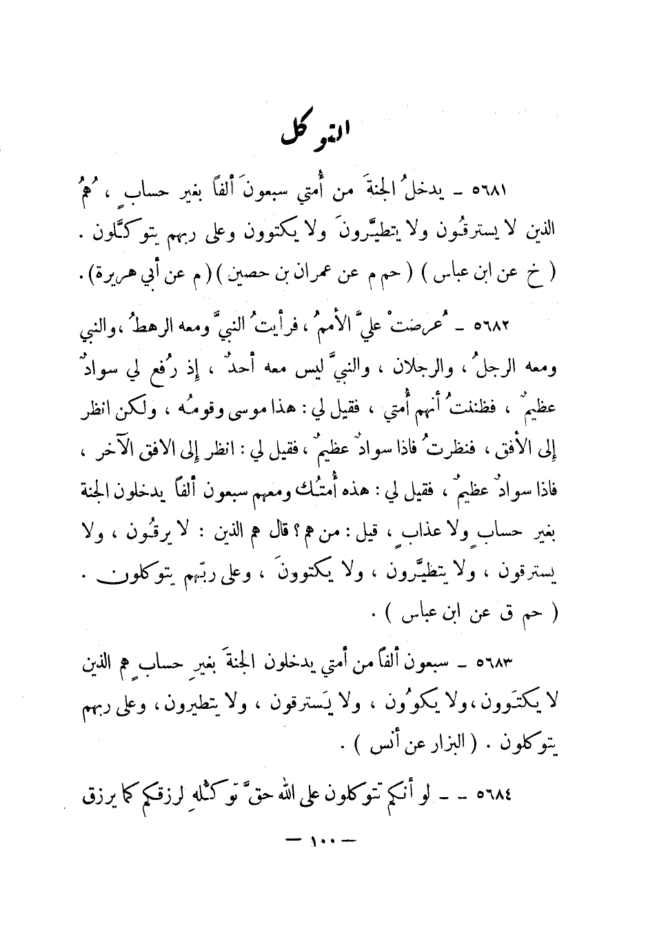 5681- يدخل الجنة من أمتي سبعون ألفا بغير حساب، هم الذين لا يسترقون ولا يتطيرون ولا يكتوون وعلى ربهم يتوكلون. "خ عن ابن عباس" "حم م عن عمران بن حصين" "م عن أبي هريرة".