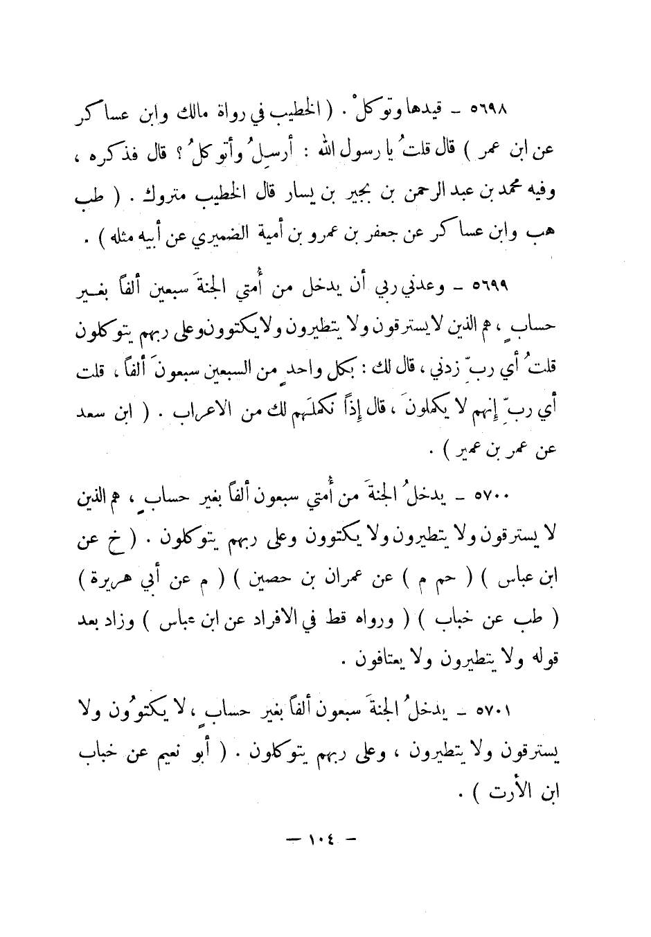 5700- يدخل الجنة من أمتي سبعون ألفا بغير حساب، هم الذين لا يسترقون ولا يتطيرون ولا يكتوون وعلى ربهم يتوكلون. "خ عن ابن عباس" "حم م" عن عمران بن حصين" "م عن أبي هريرة" "طب عن خباب" "ورواه قط في الأفراد عن ابن عباس" وزاد بعد قوله ولا يتطيرون ولا يعتافون.