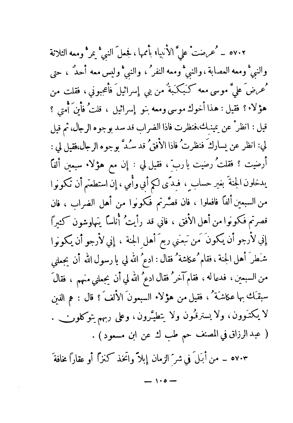 5702- عرضت علي الأنبياء بأممها، فجعل النبي يمر ومع الثلاثة والنبي ومعه العصابة، والنبي ومعه النفر، والنبي وليس معه أحد، حتى عرض علي موسى معه كبكبة من بني إسرائيل فأعجبوني، فقلت: من هؤلاء؟ فقيل: هذا أخوك موسى ومعه بنو إسرائيل، قلت: فأين أمتي؟ قيل: انظر عن يمينك، فنظرت فإذا الضراب قد سد بوجوه الرجال، ثم قيل لي: انظر عن يسارك فنظرت فإذا الأفق قد سد بوجوه الرجال، فقيل لي: أرضيت؟ فقلت: رضيت يا رب، فقيل لي: إن مع هؤلاء سبعين ألفا يدخلون الجنة بغير حساب، فدى لكم أبي وأمي، إن استطعتم أن تكونوا من السبعين ألفا فافعلوا، فإن قصرتم فكونوا من أهل الضراب، فإن قصرتم فكونوا من أهل الأفق، فإني قد رأيت أناسا يتهاوشون كثيرا إني لأرجو أن يكون من تبعني ربع أهل الجنة، إني لأرجو أن يكونوا شطر أهل الجنة، فقام عكاشة فقال: ادع الله لي يا رسول الله أن يجعلني من السبعين، فدعا له، فقام آخر فقال ادع الله لي أن يجعلني منهم، فقال: سبقك بها عكاشة، فقيل من هؤلاء السبعون الألف؟ قال: هم الذين لا يكتوون، ولا يسترقون ولا يتطيرون، وعلى ربهم يتوكلون. "عبد الرزاق في المصنف حم طب ك عن ابن مسعود".