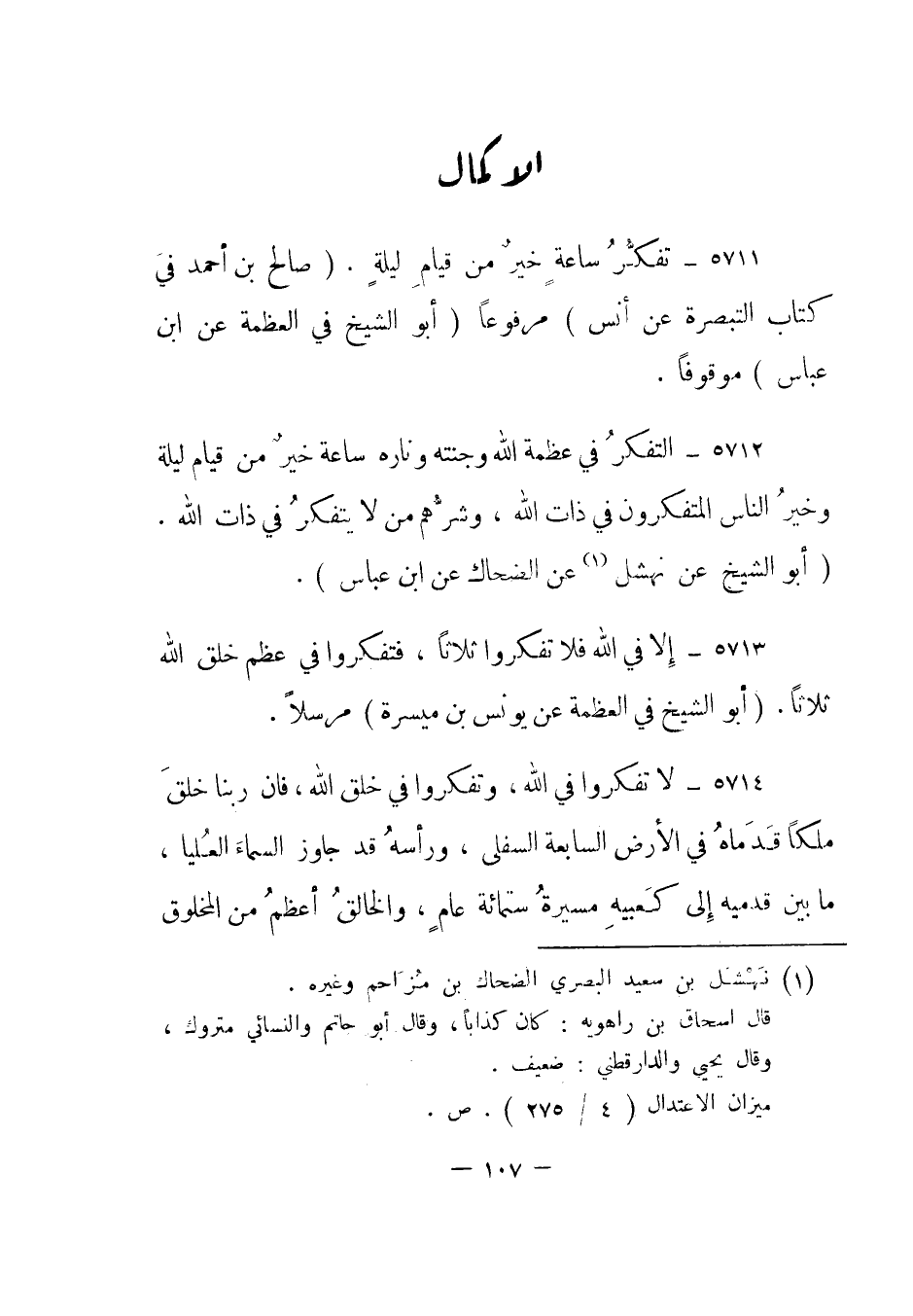 5711- تفكر ساعة خير من قيام ليلة. "صالح بن أحمد في كتاب التبصرة عن أنس" مرفوعا، "أبو الشيخ في العظمة عن ابن عباس" موقوفا.