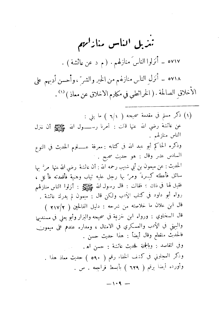 5718- أنزل الناس منازلهم من الخير والشر، وأحسن أدبهم على الأخلاق الصالحة. "الخرائطي في مكارم الأخلاق عن معاذ"1.