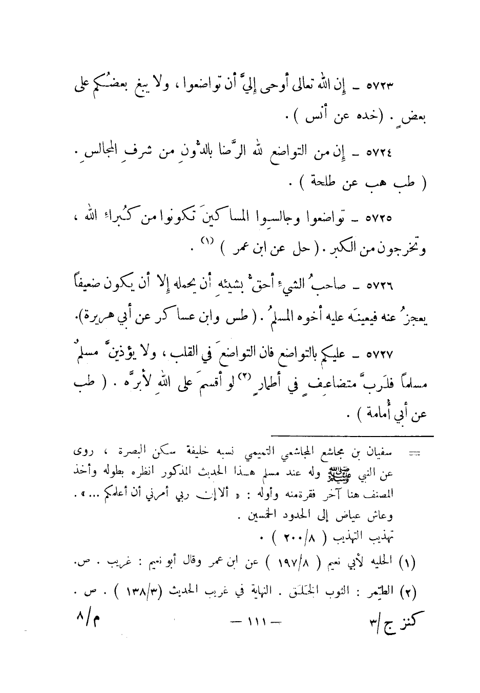 5725- تواضعوا وجالسوا المساكين تكونوا من كبراء الله، وتخرجون من الكبر. "حل عن ابن عمر"1.