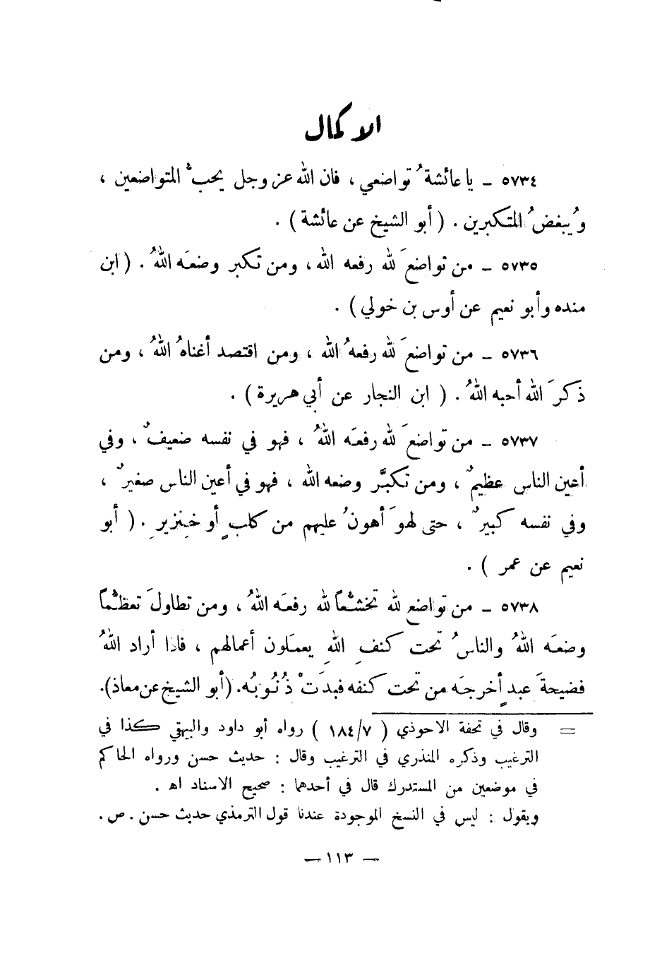 5734- يا عائشة تواضعي، فإن الله عز وجل يحب المتواضعين، ويبغض المتكبرين. "أبو الشيخ عن عائشة".
