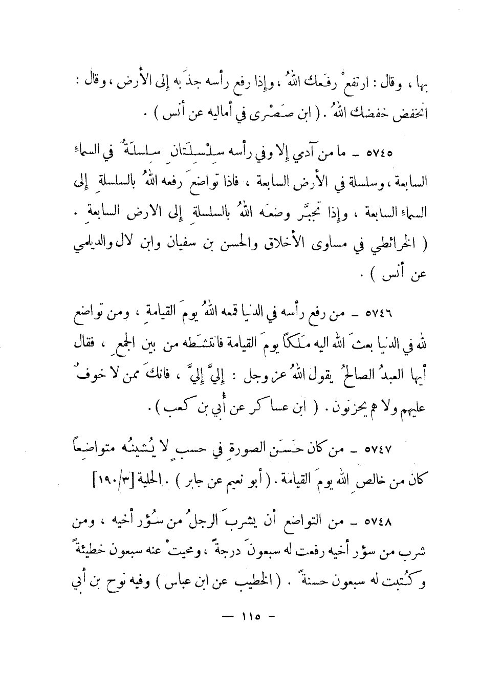 5747- من كان حسن الصورة في حسب لا يشينه متواضعا كان من خالص الله يوم القيامة. "أبو نعيم عن جابر". الحلية [3/190] .