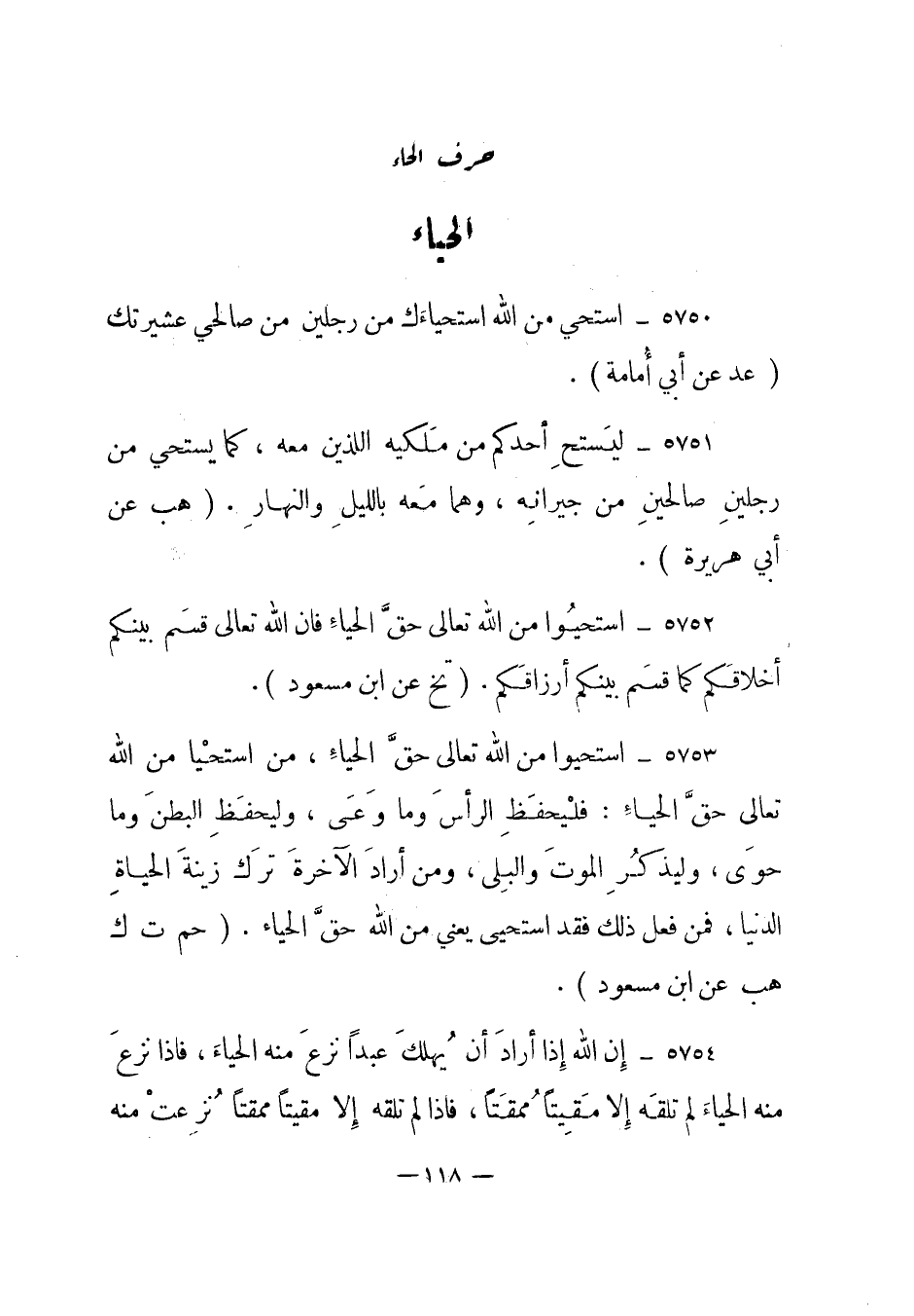 5751- ليستح أحدكم من ملكيه اللذين معه، كما يستحي من رجلين صالحين من جيرانه، وهما معه بالليل والنهار. "هب عن أبي هريرة".