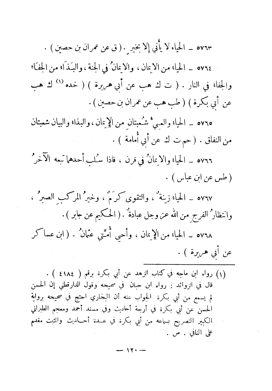5764- الحياء من الإيمان، والإيمان في الجنة، والبذاء من الجفاء والجفاء في النار. "ت ك هب عن أبي هريرة" "خده1 ك هب" عن أبي بكرة "طب هب عن عمران ابن حصين".
