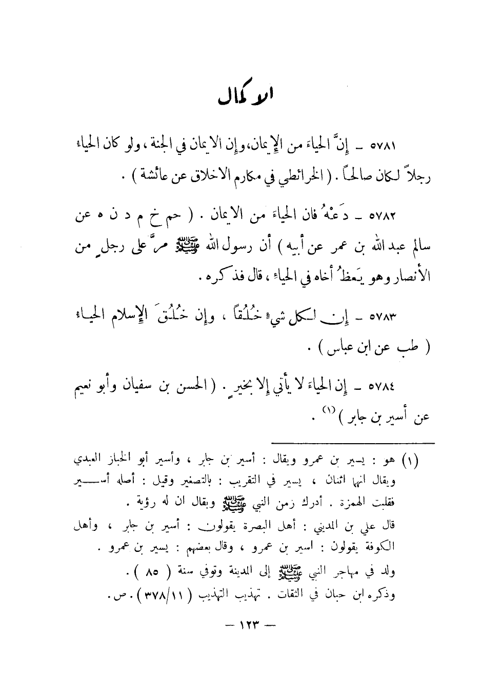 5784- إن الحياء لا يأتي إلا بخير. "الحسن بن سفيان وأبو نعيم عن أسير بن جابر"1.