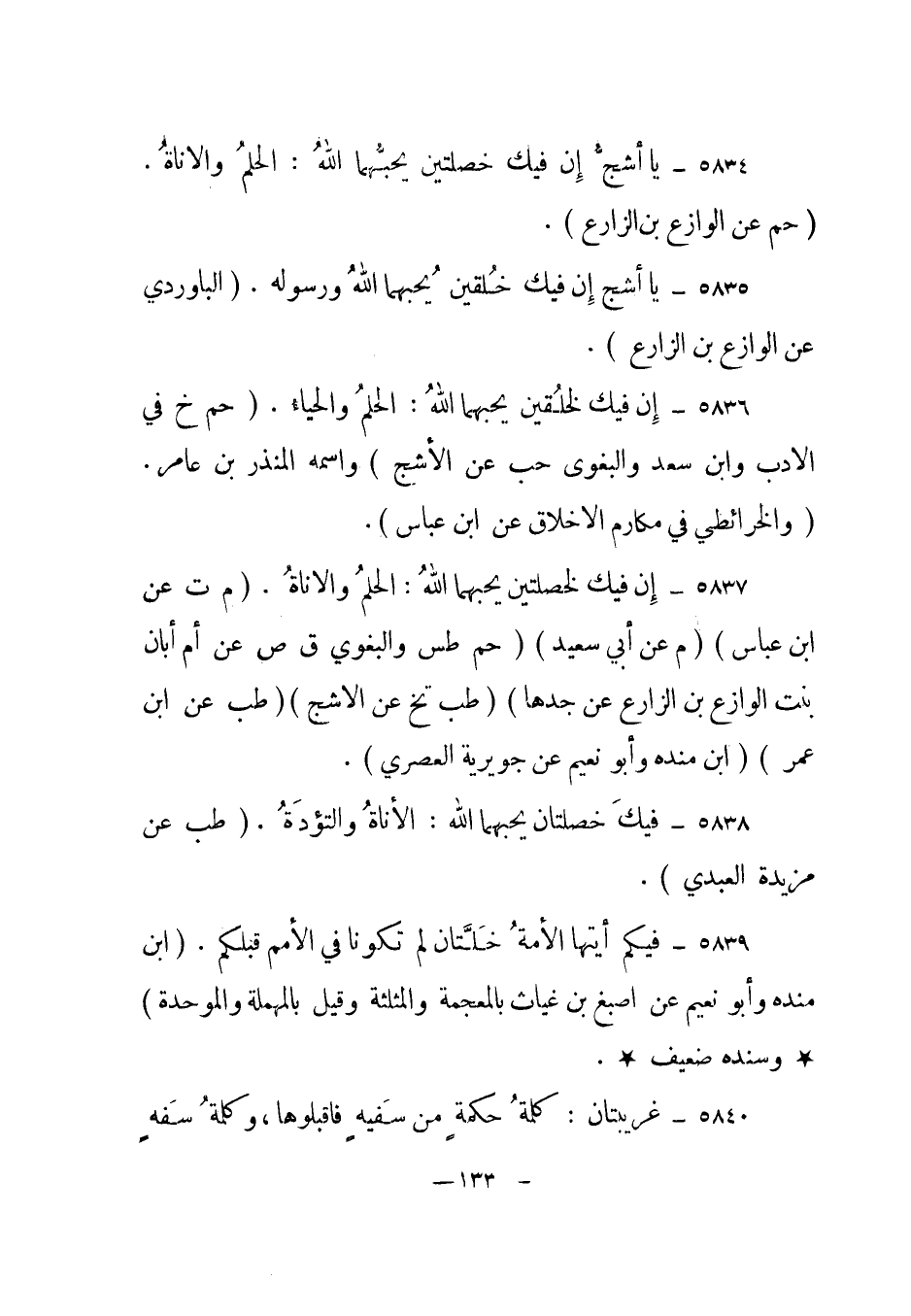 5838- فيك خصلتان يحبهما الله: الأناة والتؤدة. "طب عن مزيدة العبدي".