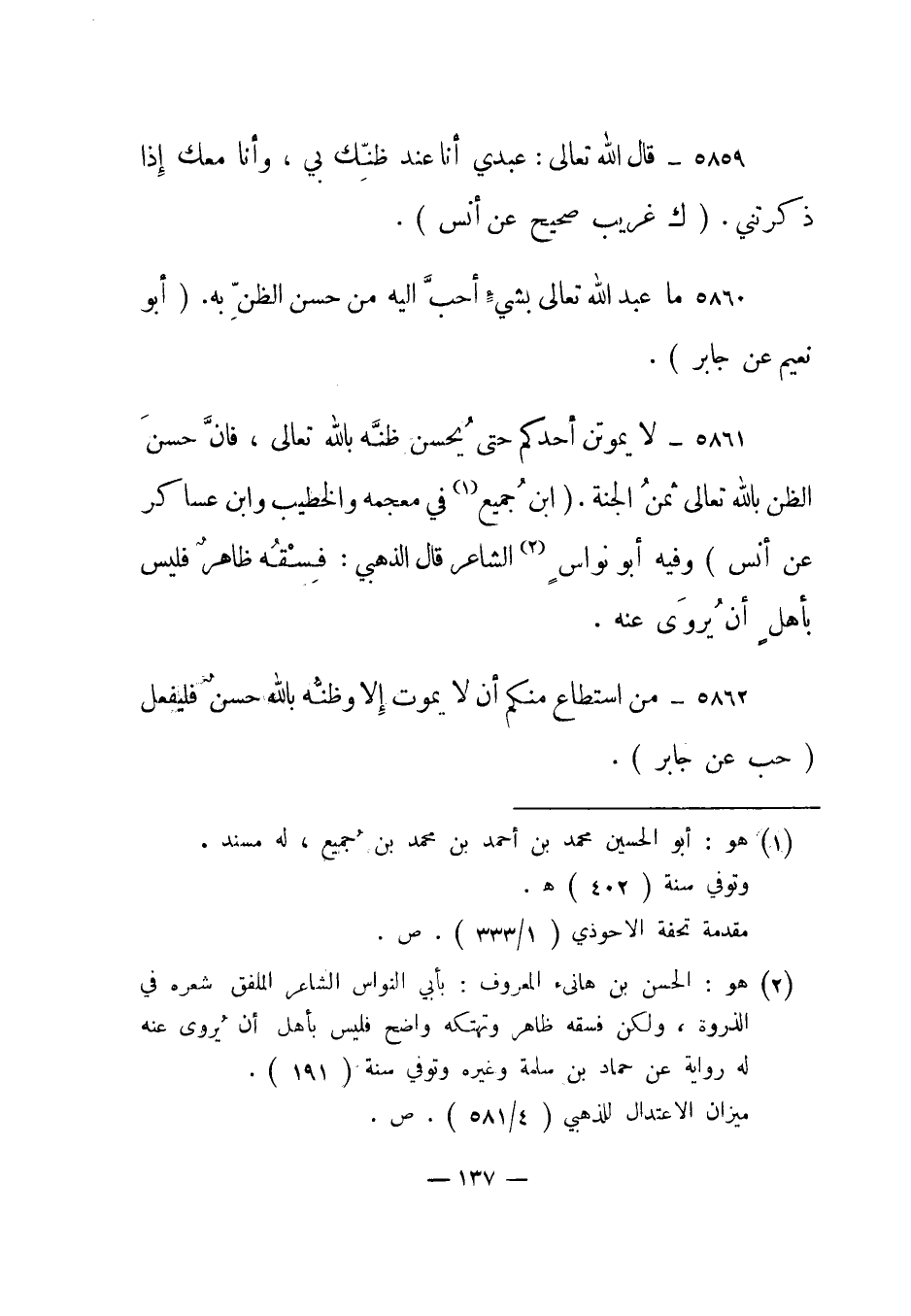 5861- لا يموتن أحدكم حتى يحسن ظنه بالله تعالى، فإن حسن الظن بالله تعالى ثمن الجنة. "ابن جميع1 في معجمه والخطيب وابن عساكر عن أنس" وفيه أبو نواس2 الشاعر، قال الذهبي: فسقه ظاهر فليس بأهل أن يروى عنه.