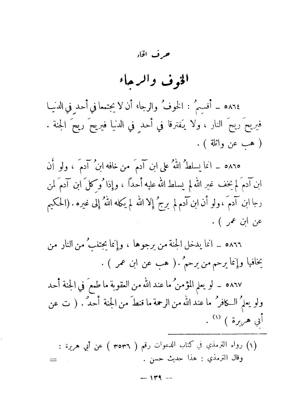 5867- لو يعلم المؤمن ما عند الله من العقوبة ما طمع في الجنة أحد ولو يعلم الكافر ما عند الله من الرحمة ما قنط من الجنة أحد. "ت عن أبي هريرة"1.