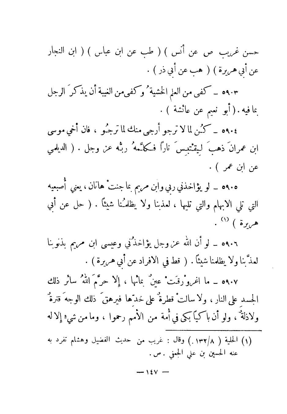 5905- لو يؤاخذني ربي وابن مريم بما جنت هاتان، يعني أصبعيه التي تلي الإبهام والتي تليها، لعذبنا ولا يظلمنا شيئا. "حل عن أبي هريرة"1.