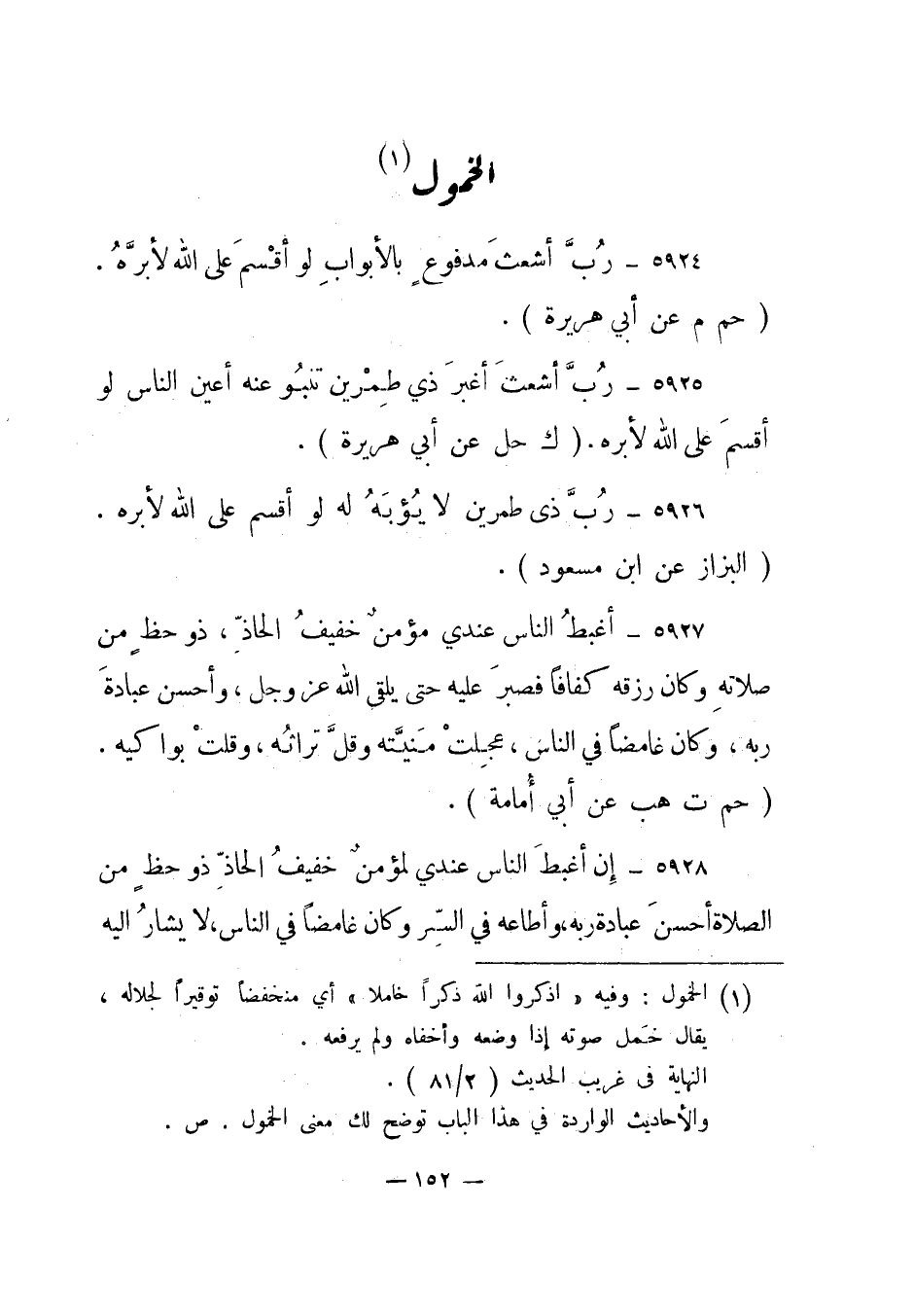 5926- رب ذى طمرين لا يؤبه له لو أقسم على الله لأبره. "البزاز عن ابن مسعود".