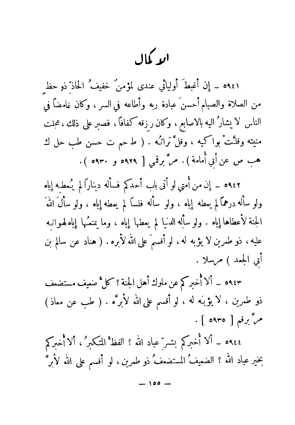 5944- ألا أخبركم بشر عباد الله؟ الفظ المتكبر، ألا أخبركم بخير عباد الله؟ الضعيف المستضعف ذو طمرين، لو أقسم على الله لأبر