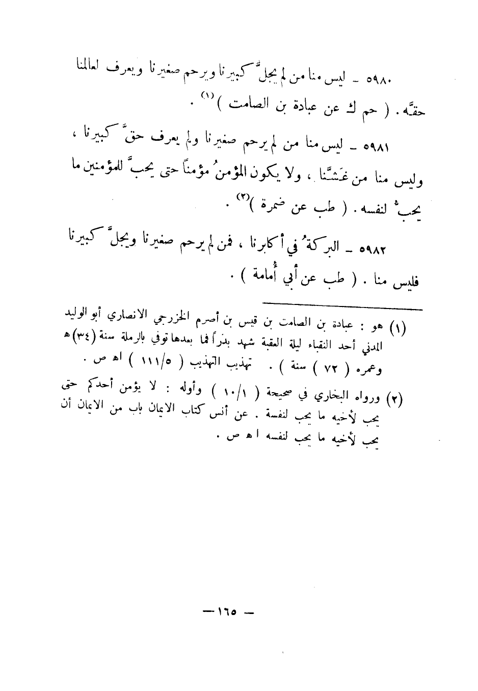 5980- ليس منا من لم يجل كبيرنا ويرحم صغيرنا ويعرف لعالمنا حقه. "حم ك عن عبادة بن الصامت"1.