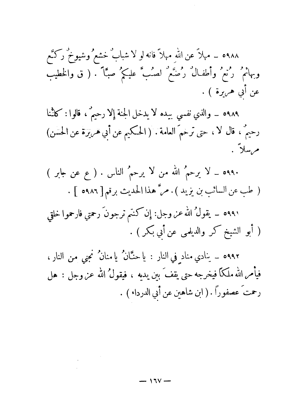 5992- ينادي مناد في النار: يا حنان يا منان نجني من النار، فيأمر الله ملكا فيخرجه حتى يقف بين يديه، فيقول الله عز وجل: هل رحمت عصفورا. "ابن شاهين عن أبي الدرداء".