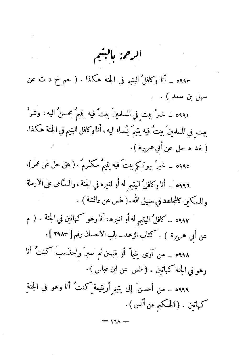 5999- من أحسن إلى يتيم أو يتيمة كنت أنا وهو في الجنة كهاتين. "الحكيم عن أنس".