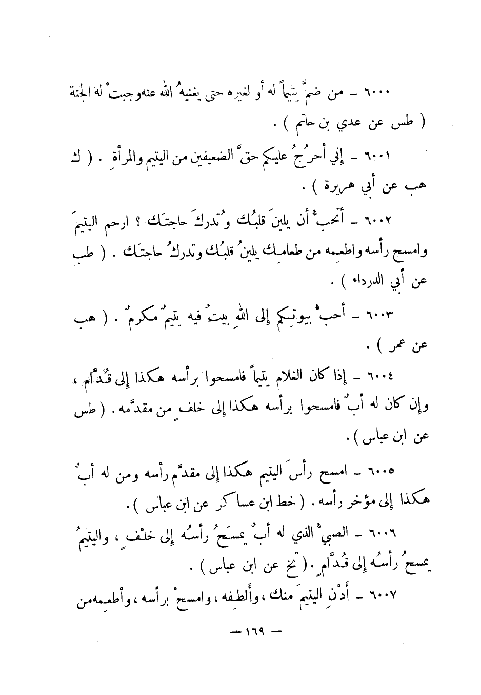 6006- الصبي الذي له أب يمسح رأسه إلى خلف، واليتيم يمسح رأسه إلى قدام. "تخ عن ابن عباس".