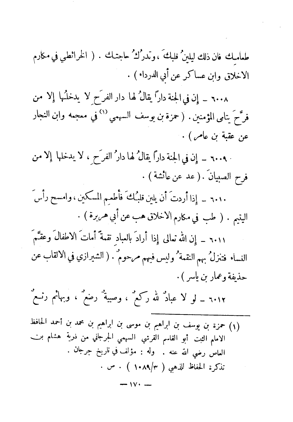 6008- إن في الجنة دارا يقال لها دار الفرح لا يدخلها إلا من فرح يتامى المؤمنين. "حمزة بن يوسف السهمي"1 في معجمه وابن النجار عن عقبة بن عامر.