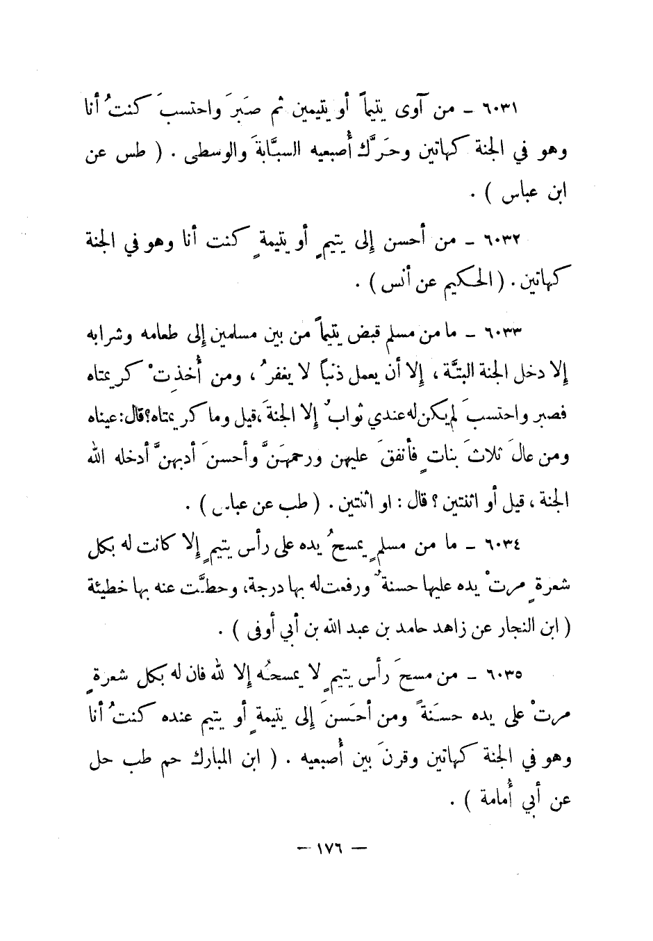 6034- ما من مسلم يمسح يده على رأس يتيم إلا كانت له بكل شعرة مرت يده عليها حسنة ورفعت له بها درجة، وحطت عنه بها خطيئة. "ابن النجار عن زاهد حامد بن عبد الله بن أبي أوفى".