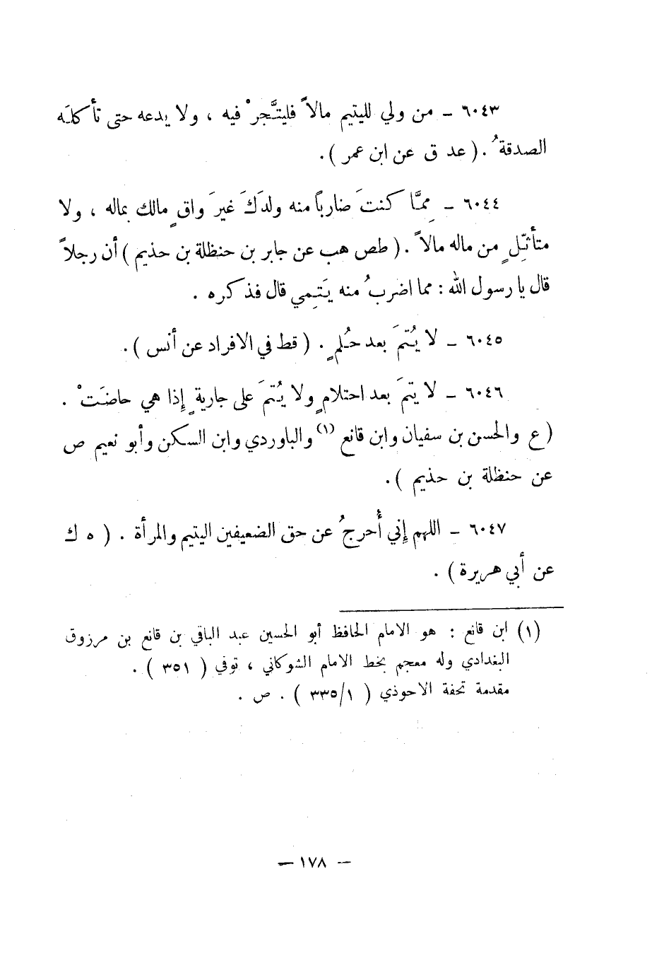 6046- لا يُتْمَ بعد احتلام ولا يتم على جارية إذا هي حاضت. "ع والحسن بن سفيان وابن قانع1. والبارودي وابن السكن وأبو نعيم ص عن حنظلة بن حذيم".