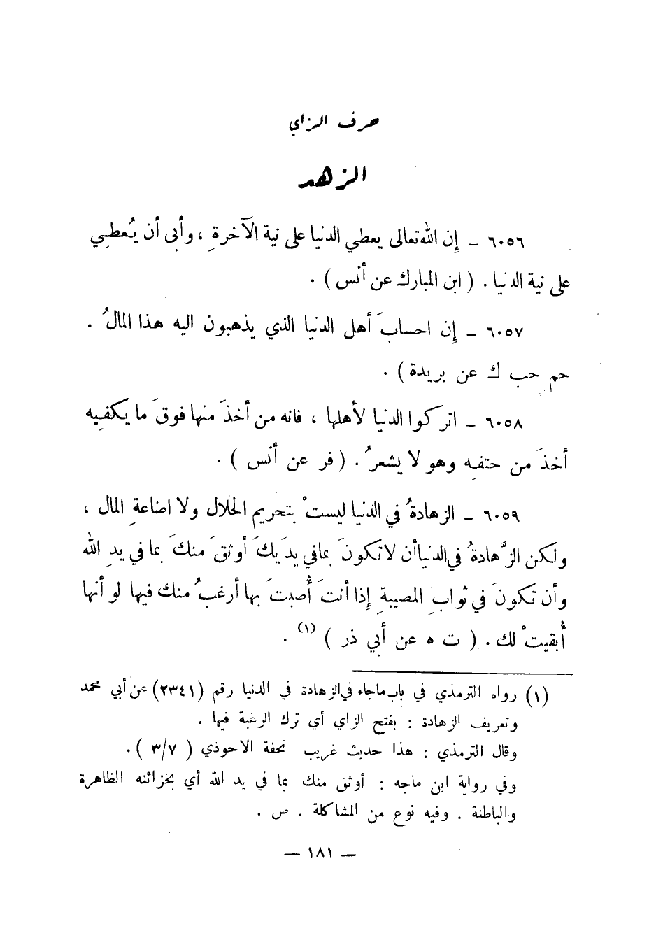 6059- الزهادة في الدنيا ليست بتحريم الحلال ولا إضاعة المال، ولكن الزهادة في الدنيا أن لا تكون بما في يديك أوثق منك بما في يد الله وأن تكون في ثواب المصيبة إذا أنت أصبت بها أرغب منك فيها لو أنها أبقيت لك. "ت هـ عن أبي ذر"1.
