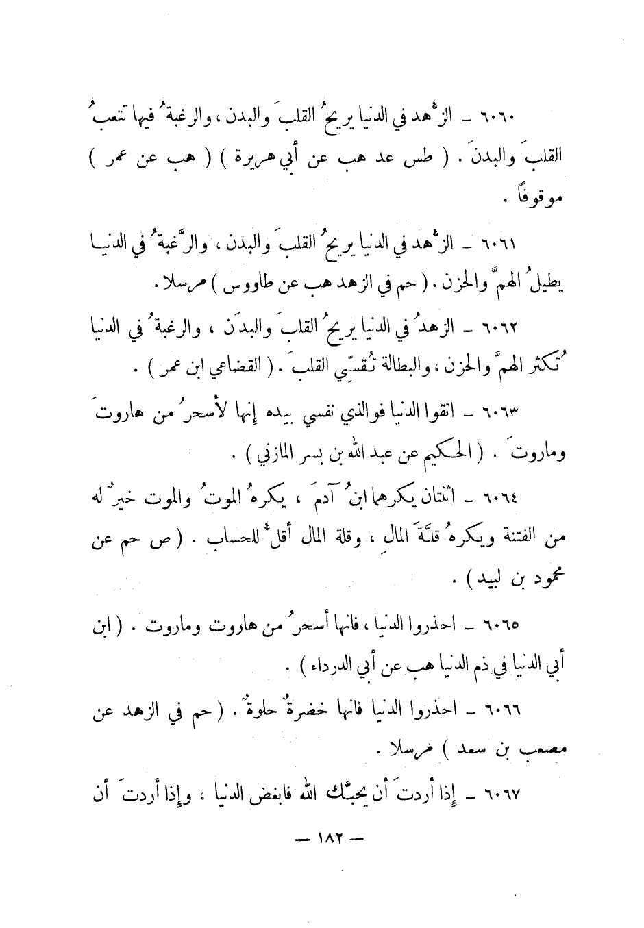6060- الزهد في الدنيا يريح القلب والبدن، والرغبة فيها تتعب القلب والبدن. "طس عد هب عن أبي هريرة" "هب عن عمر" موقوفا.