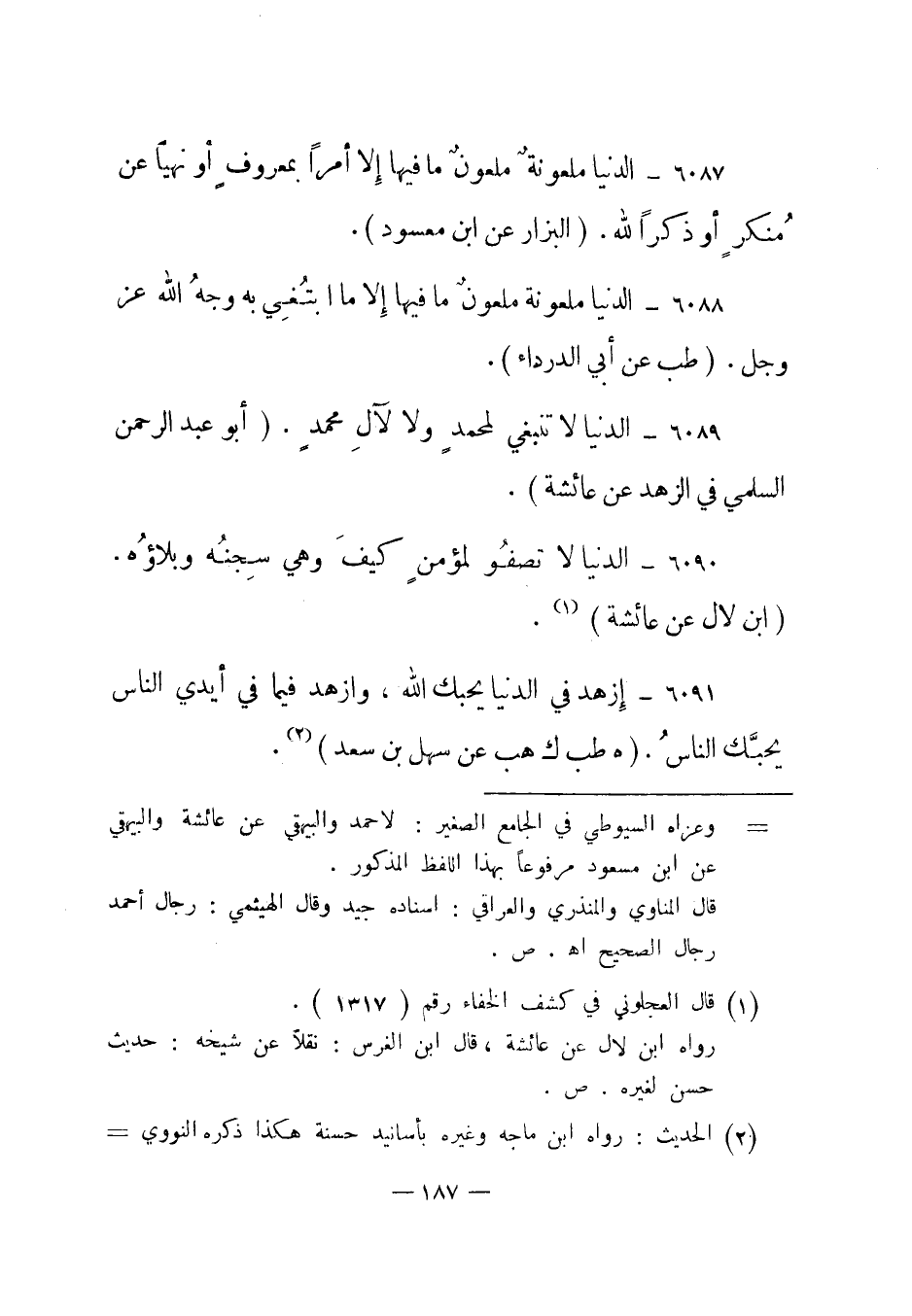 6090- الدنيا لا تصفو لمؤمن كيف وهي سجنه وبلاؤه. "ابن لال عن عائشة"1.