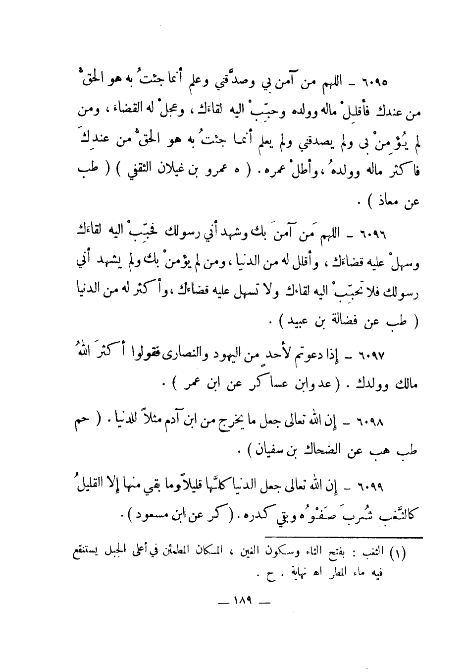 6096- اللهم من آمن بك وشهد أني رسولك فحبب إليه لقاءك وسهل عليه قضاءك، وأقلل له من الدنيا، ومن لم يؤمن بك ولم يشهد أني رسولك فلا تحبب إليه لقاءك ولا تسهل عليه قضاءك، وأكثر له من الدنيا. "طب عن فضالة بن عبيد".