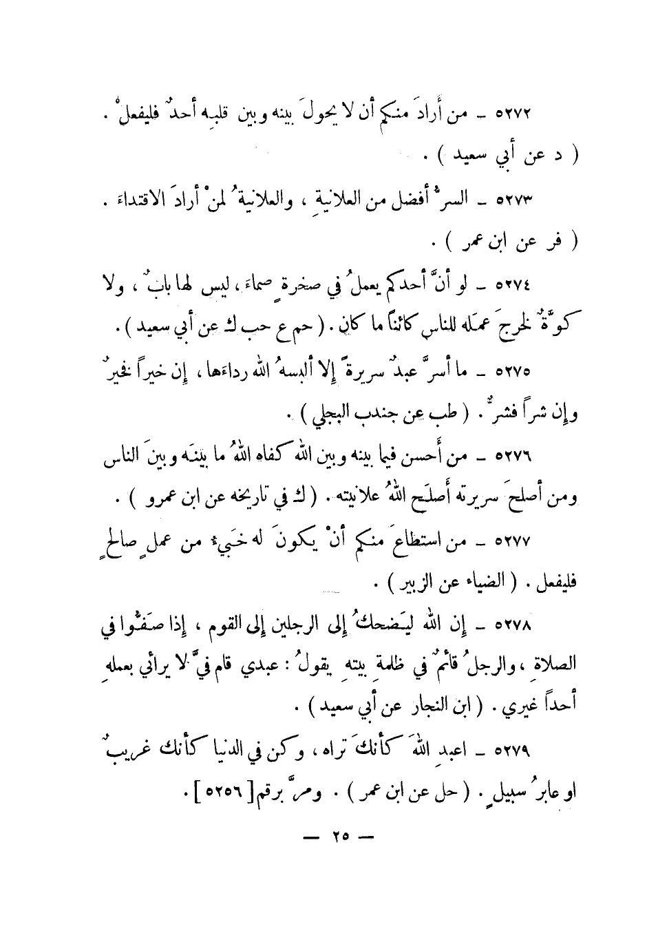 5273- السر أفضل من العلانية، والعلانية لمن أراد الإقتداء. "فر عن ابن عمر".